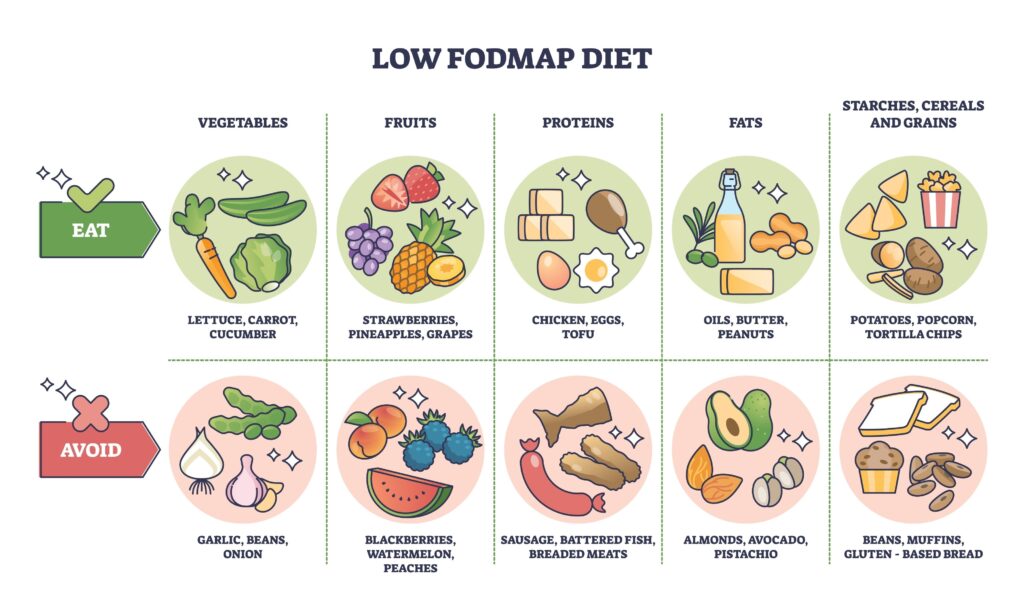 FODMAPとは、特定の糖類(発酵性のオリゴ糖、二糖類、単糖類、ポリオール)の頭文字です。これらは小腸で吸収されにくく、大腸で腸内細菌のエサになりやすい。その結果、ガスが発生し、お腹の張りや腹痛を引き起こすというのです。